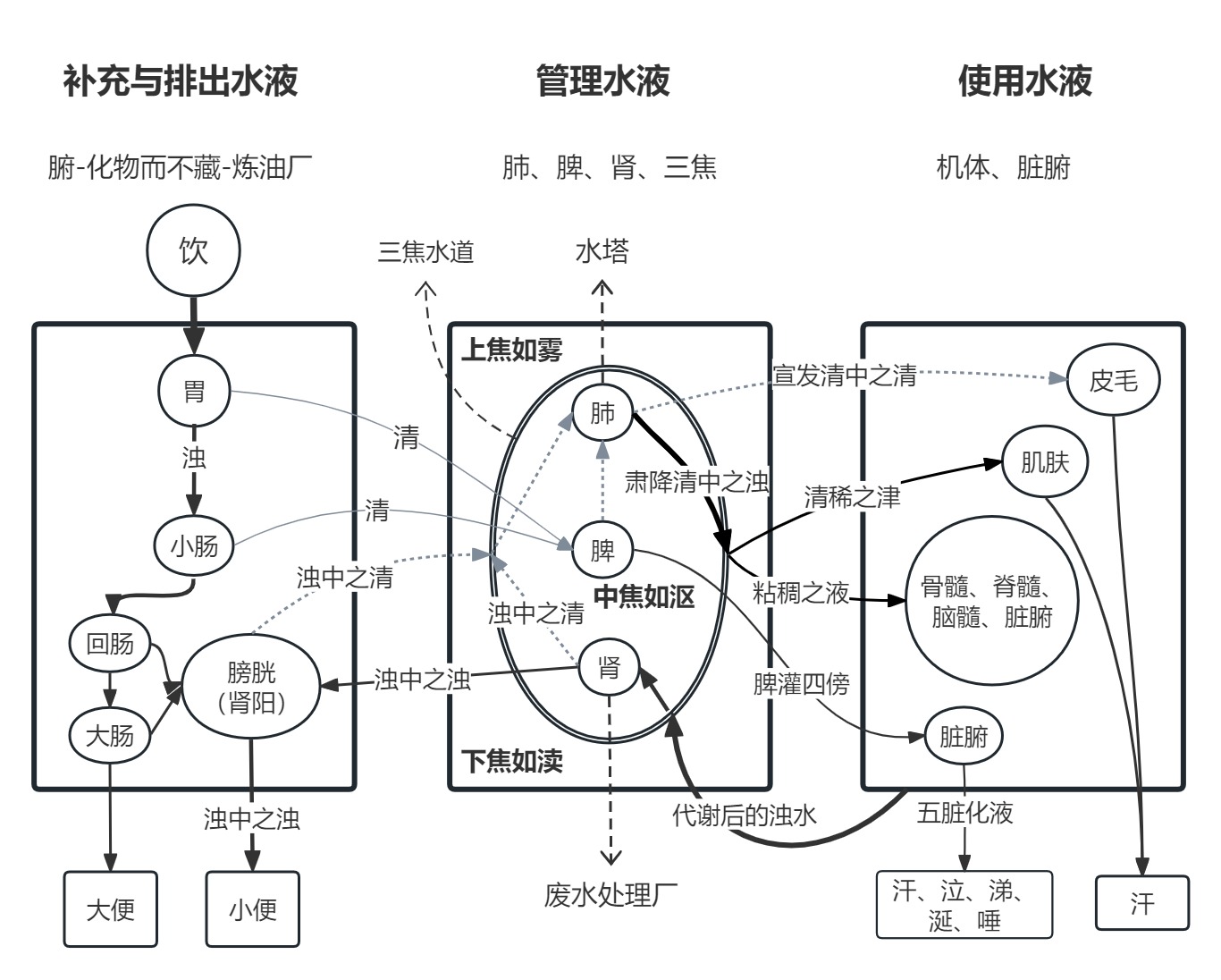 痰饮的产生大多是因为管理水液的器官出现病证,导致水的代谢出现障碍而产生痰饮。这些器官包括胃、脾、肠、肺、三焦、肾、膀胱等,具体请参考《概念入门》津液章节的津液代谢图。