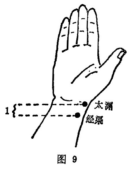 〔定位〕在胞横纹上1寸,当桡骨茎突内缘与桡动脉之间凹陷处(图9) 。
